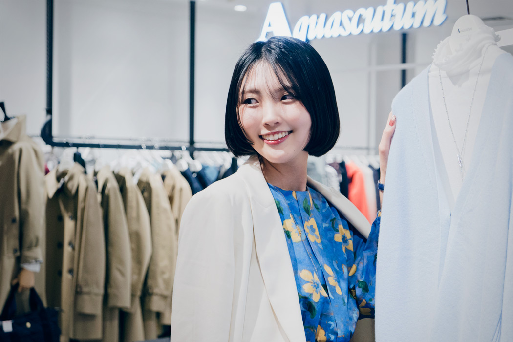 2018年に販売職として入社し、現在はアクアスキュータムでサブチーフとして販売に携わっています。店頭スタッフは少数精鋭のため、早い段階から接客だけでなく店舗運営に関わる幅広い業務を経験できました。現在は自店の公式LINEアカウントも担当しており、店舗での販売を超えたお客様の満足度向上にも努めています。アパレルの販売は、接客に限らず日々様々な場面で喜びを感じる機会の多い仕事ですが、やはりお客様に直接関わり、笑顔にできることが私にとって大きなやりがいです。以前あるお客さまから「『お気に入りのスタッフがいるからこのお洋服屋さんに行こう!』と思えたのはあなたが初めてです」とお言葉をいただけた時はとても嬉しかったですし、何年経っても忘れない大切にしている言葉です。普段“推し活”をしている身として、自分自身も誰かの楽しみになっていることにやりがいを感じます。