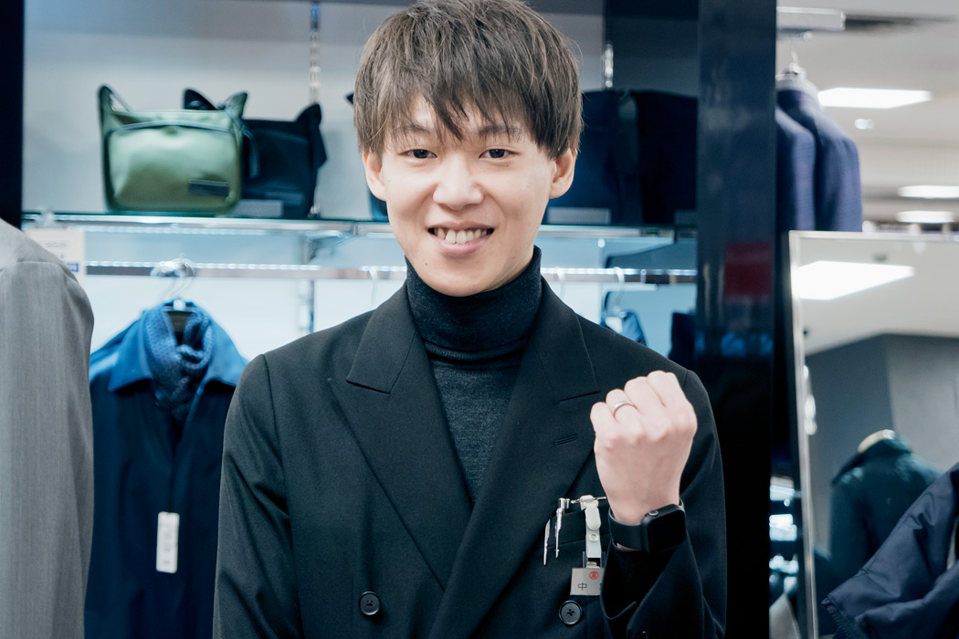 お客様と直接関わる仕事ですから、お客様の喜びや満足をダイレクトに知ることができるところです。オーダーでスーツをお作りいただく際には、お客様のご要望や好み、普段のスタイルなど細かくヒアリングし、それに寄り添った提案をするようにしています。出来上がって袖を通してもらうまでは緊張や責任感を感じますが、気に入っていただけた笑顔が見られたり感謝の言葉をいただくと、この仕事をやっていてよかったと大きなやりがいを感じます。さらに再度ご来店いただき、また担当させていただけることもすごく嬉しいです。